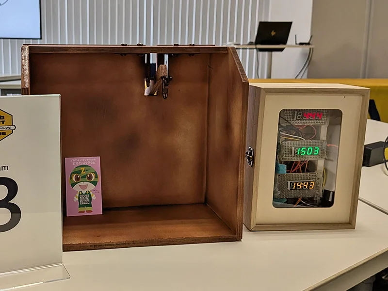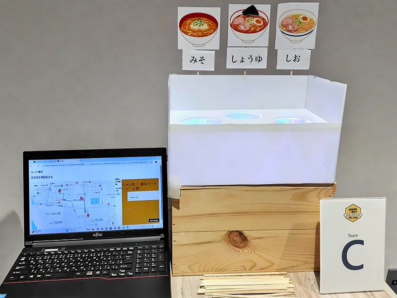 - 観光客が寄り道できる秋田の人気ラーメンを表示し、使用済み割り箸を集めて投票もできるエコな IoT ゴミ箱✕投票箱。秋田県の観光振興や地域活性化を図る上で、観光客の「目的地以外への立ち寄り」を増やすことが重要であると考え、秋田県にはおいしいラーメン店が多く存在する一方で、その魅力が十分に情報発信されていないことから本作品を考案した。食事後に使用済みの割りばしをそのまま投票に利用することで、直感的で複雑な操作を必要としない仕組みとした。投票結果を地図上で可視化することで、来店者がこれまで知らなかった店舗やメニューを発見しやすくし、寄り道や新たな来店行動を促すことができる。また、箸がセンサーの検知部分をスムーズに通過するよう、ロートを用いるなど、構造や外観にも工夫を施した。