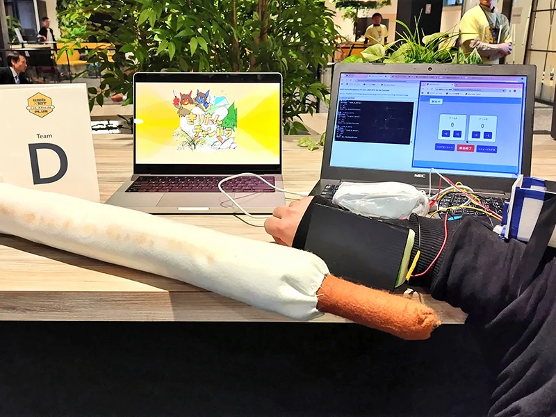 - 秋田名物「きりたんぽ」を武器に見立て、防具 (こて) を叩き合う新感覚の IoT スポーツデバイス。深刻な人口減少に直面する秋田に「新たな遊び場と交流」を生み出すべく開発された作品。単なる接触検知ではなく、3 軸加速度センサーによる「振りの動作」と「物理スイッチの押下」を複合的に解析。誤得点を防ぎ、スポーツとしての厳密な競技性をハード・ソフト両面で実現。QR コード読み取りによる「必殺技」の音声演出でエンタメ性を高めつつ、戦績を Web 上でリアルタイム管理。「きりたんぽ×チャンバラ」というコミカルかつ強力なフックで、老若男女を巻き込む地域活性化の新しい形を提案する。