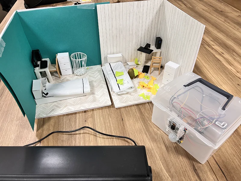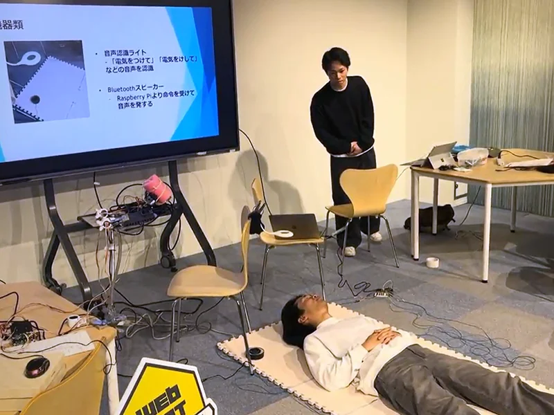 - 一人暮らしをする学生たちの中には、自力での掃除を諦めた者たちが一定数存在する。そこで必要なのは、「やる気」ではなく「他人の目」である。本作品は、AI が部屋の汚さをスコア化 + アドバイスし、改善が見られない場合は家族へ画像を自動送信することで、あえて自らの退路を断つ「掃除支援 × 部屋共有 Web アプリ」である。”Raspberry Pi + カメラ + 人感センサー + スピーカー”による無人時の自動部屋監視やアドバイス指導、”Web アプリ”では他ユーザーと部屋画像を共有するタイムライン機能等を実装。部屋の汚さスコアが改善しない場合、指定のメール (家族等を想定) へ公開リンクが共有される。怠け者の「やる気」に頼らず、システムによる「他人の目」で清潔な空間を維持するソリューションである。