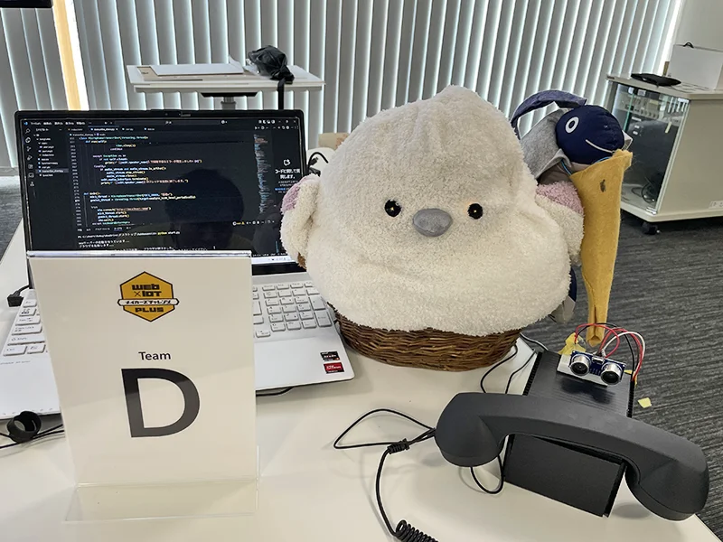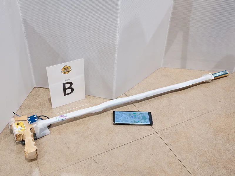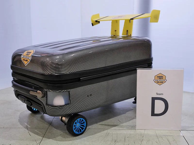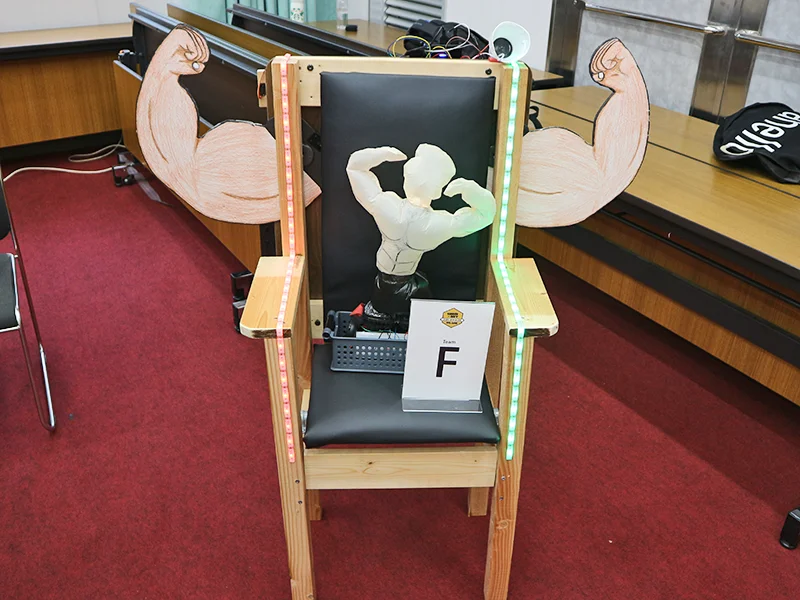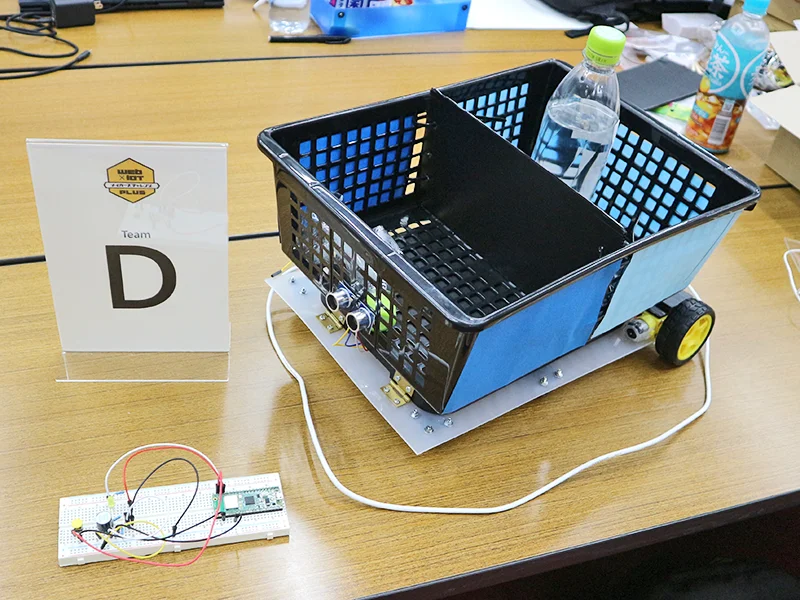 - スポーツの試合観戦における水分補給不足や熱中症、ゴミのポイ捨て、熱狂度の高さゆえの暴言などの問題を解決するための自律移動するロボット。ボタンが押されると観客のもとへ行き飲み物を配る機能では、ボタンを押すことで Wi-Fi 経由で位置を認識し自分で押されたボタンの場所まで来る仕組み。ゴミの回収を行う機能は、配るスペースを半分に区切ることで回収するスペースも確保している。暴言などの不適切な発言を減らす機能は、マイクを通して拾った発言を Web 経由し判定、不適切な発言を検知次第、ブザーが鳴り、LED が光る仕組み。音などで検知して動くのではなく、ボタン側と機体側の 2 つを使い、Wi-Fi で通信して移動する点が工夫した点。