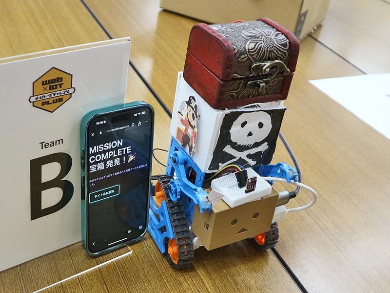 - スマートフォンへ依存気味の小中学生を対象に、広い運動公園などでゲーム感覚で楽しめる IoT 宝探しゲーム。近年岡山県内で盛り上がりを見せているプロスポーツイベントの開催に、このゲームを合わることで競技への認知度を上げ、観戦者、競技者を増やして県内のスポーツを盛り上げたい狙い。ゲームの仕組みは、移動型ロボットの上部に宝箱を設置し、指定した位置まで、搭載した GPS モジュールの情報を元に自動で移動し続け、プレイヤーはゲームのスマホアプリに表示された宝箱の位置情報を元に探索する。宝箱にはスマホを使用する上で必要不可欠な充電ケーブル等を格納し、プレイヤーが宝箱に近づくと、位置情報を元に宝箱が自動で開く。宝箱に近づいたときの宝箱の自動開閉の制御。距離センサーの情報とカムロボットの制御を元にした、障害物の回避が工夫点。
