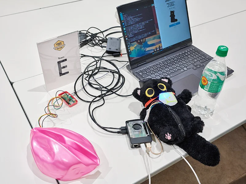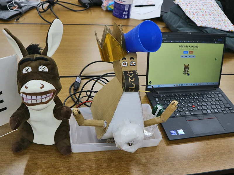 - 昨今のスポーツ観戦で問題になっている、観客の過激化や争い。俗にいうフーリガンと呼ばれる人たちを減らすことを課題とし、その一環としてストレス発散のためのマスコットを開発した。スタジアムに設置し個人のストレスや思いの丈をその場で発散できることがコンセプト。マスコットに向かって叫ぶと音の大きさ (デシベル) を測定できるようになっており、ランキング形式でデシベルと時間を可視化する。また、一定のデシベルを超えると水を吹きかける機能があり物理的に頭を冷やしてくれる。ソフト面では、デシベルの測定を常時ではなくボタンを押して 10 秒間受け付けするようにした点や、10 秒間では 1 回しか水を出ないようにした点、ハード面では、ロバの耳をモチーフに段ボールとプラダンボールを使って手作りでロバを作った点が工夫点。