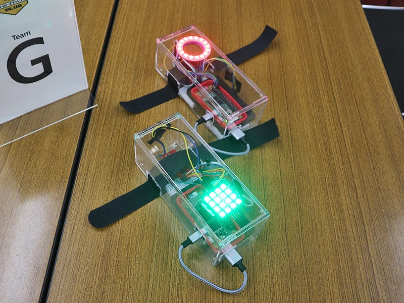 - 学校で行う「身体測定」を楽しく過ごすためのデバイス。時間の無駄が多い待ち時間の間、生徒は Raspberry Pi で作られたカラオケボックスで楽しむことができる。プロジェクターで歌詞画面を投影し、マイクで認識した歌声を取得。音声の高低を判定し、イルミネーションで音域のずれをフィードバックしてくれる。また身体測定自体も簡単に行うことができる。ボタンを押すと測距センサーが作動し、瞬時に身長などを測定。そのデータはオンラインのスプレッドシートに蓄積される。記録の自動化によって、入力作業の手間を省く工夫が凝らされている。
