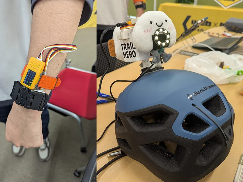 - 複数人での登山を想定した携帯型デバイス。複数人で登山を行う際の課題である、チームメンバーの体調管理、視界不良や滑落などによるメンバーの遭難の 2 点を解決するデバイスを考えた。デバイスは親機と子機があり、先頭を歩くリーダーが親機を携帯、その他のメンバーはそれぞれ子機を腕に装着する。子機には消費カロリーを計算するための加速度センサー、心拍センサー、体温センサーが搭載されており、親機へデータを送る。親機はスマホに接続でき、リーダーはスマホでメンバーの消費カロリーおよび休憩タイミングの確認、心拍と体温の確認ができる。また、親機と子機は Bluetooth 接続を常時行い、Bluetooth の接続が切れると親機からアラームが鳴り、メンバーがはぐれたことを知らせる。
